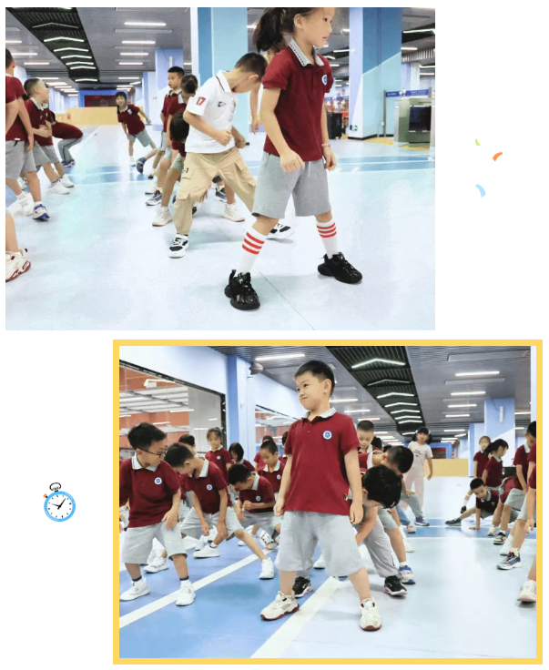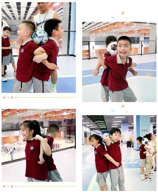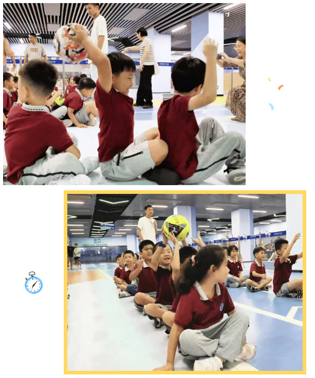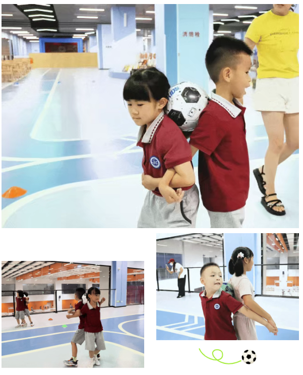 “一二一!”两人一组,背靠背夹着球,像小螃蟹横着走。“要掉了要掉了!”穿黄衣的女孩惊呼。搭档立刻放慢脚步:“慢点,我数拍子。”他们小心翼翼移动步子,其他组员在场边拍手:“加油!就快到啦!”每成功一组,身边的小伙伴都为他们热烈地鼓掌。