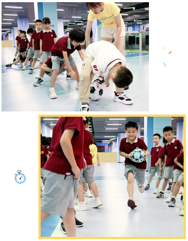 “低头!弯腰!”孩子们排成一列,双腿岔开成“小山洞”。球从胯下嗖嗖穿过。“到我啦!”前排的男生转身接球,差点摔倒,被后面的同学一把扶住。队伍像条扭动的长龙,球在“山洞”里快速穿梭。当球顺利到达终点,整队孩子欢呼着抱在一起!