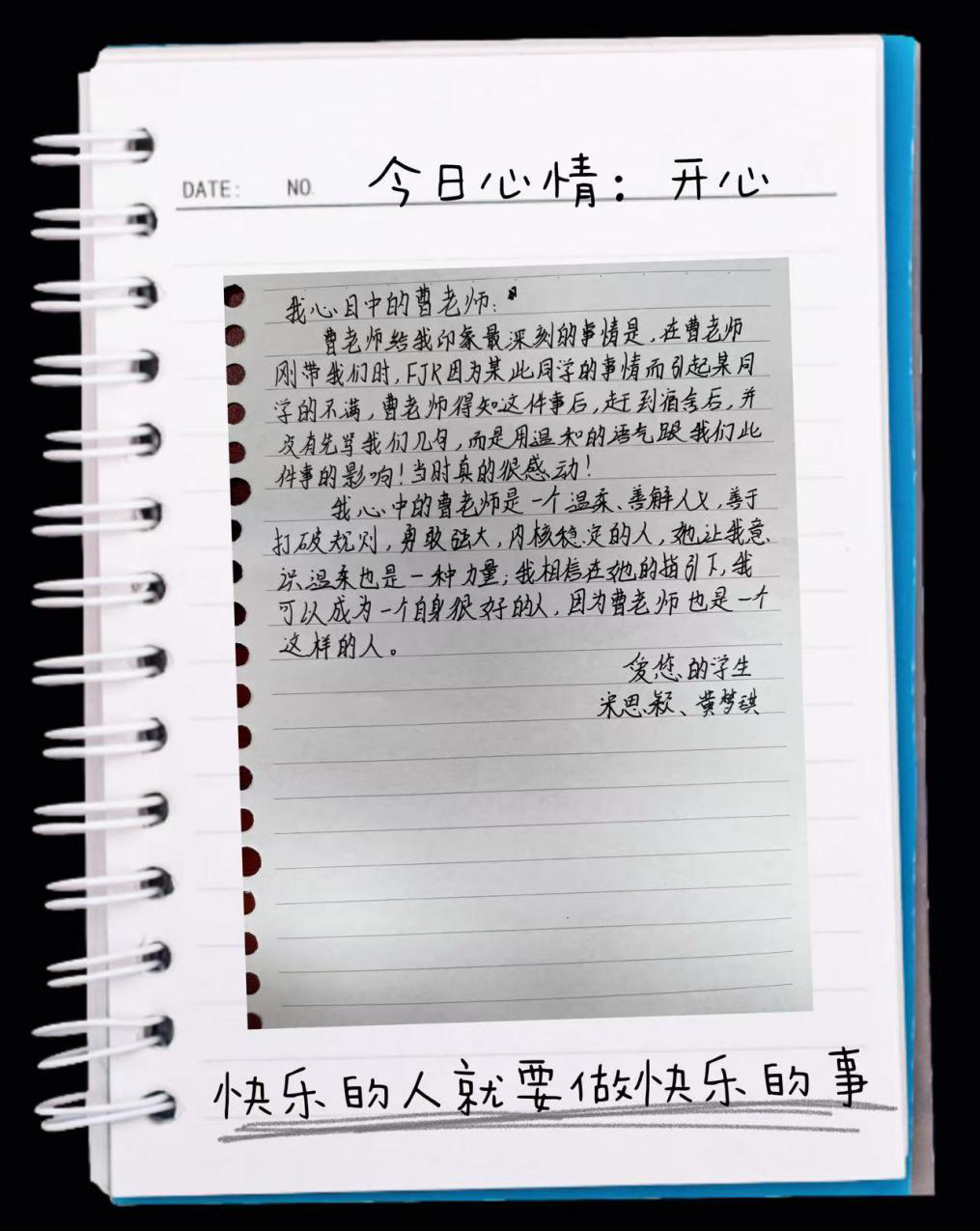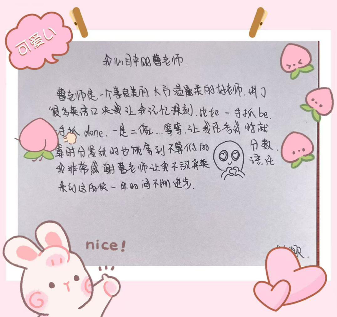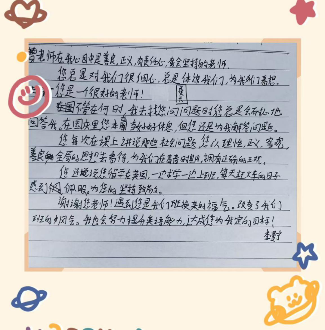 教育,在我看来并非总是波澜壮阔的史诗,更多时候,它是春风化雨的细腻,是滴水穿石的坚持。2025年2月,我新接手了801班,“同学们,大家好。很荣幸,能在这个春意盎然的早晨,成为你们航行学海的新一任‘同行者’。我是你们的新班主任兼英语老师曹老师。古人云:‘缘,妙不可言。’数十亿人海中,我们能相聚于此,共用一间教室,共度一段时光,这本身就是一种奇妙的缘分。希望在未来的一年半时间里,我们一起携手共创独属于我们的倾城时光!它不需要完美,但一定赤诚热烈。”伴随着同学们热烈的掌声,我的开场白开启了我与2023级1班学生的故事!