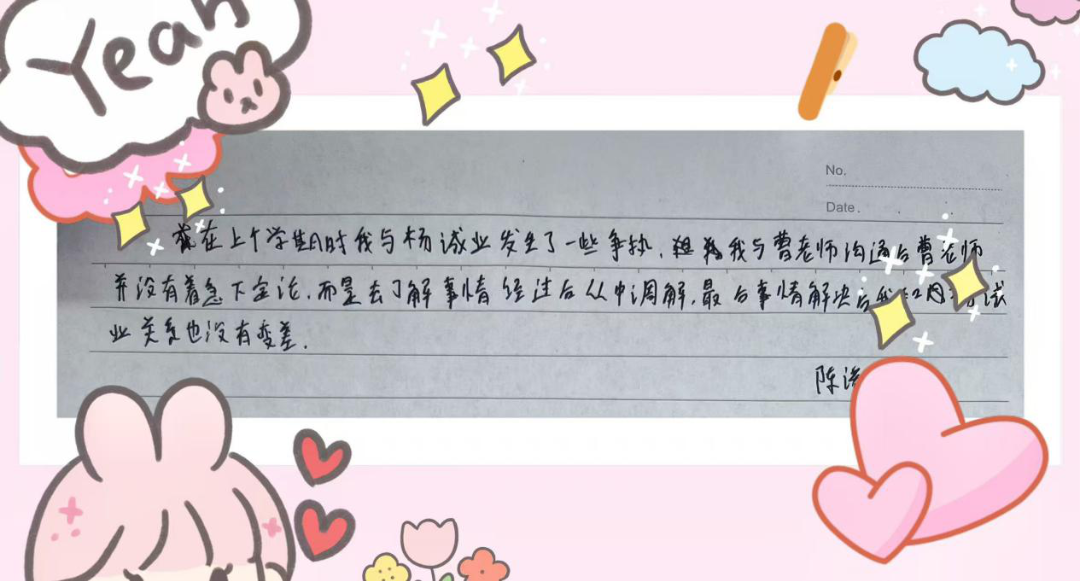 他想了一下,说尽量遵守。于是我们的第一次见面以比较圆满的方式结束。后来,他当然还是不断犯错,但是再也没有犯过“顶撞老师”这样的大错。他从频繁被各科老师投诉到逐步减少被投诉,从犯错后忙于为自己辩解到现在能够逐渐认识错误并愿意接受惩罚,从无心向学到现在主动帮助同学学习。看到他的这些变化,我怎能不欣慰?