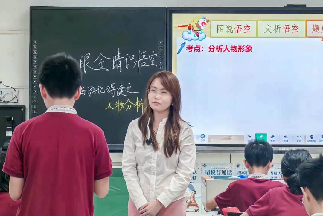 黄如嫣老师执教的是《火眼金睛识悟空——〈西游记〉导读之人物分析篇》!本节课以探究孙悟空的人物形象为主线,引导学生总结归纳分析人物形象的答题要点。任务一,学生通过小组合作绘制孙悟空的成长轨迹图,凝聚集体智慧,梳理情节脉络。任务二,学生通过赏析三打白骨精中的“三打”片段中的人物描写,概括人物形象特点,掌握系统的人物形象分析方法。任务三则鼓励学生自主学习,学生自主寻找篇章中的直接评价句或间接评价句,通过评价语句提升信息提取与整合能力。最后设置当堂练习环节,帮助学生及时巩固所学,实现活学活用。整堂课充分体现学生的主体地位,学生能够“做中学”,有效促进了语文素养的提升,落实了新课标整本书阅读的理念。