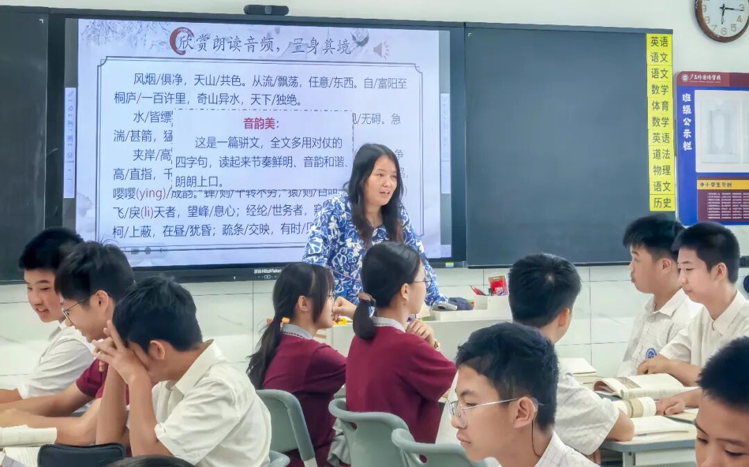 蒋珺老师执教的是八上《与朱元思书》 ,设计力求体现“四美”:语言美、结构美、课件美、板书美。蒋老师以富春江风景视频作为激趣,设置让学生当编导的驱动型任务,伴以听读、诵读,学生学习状态被有效调动,课堂氛围活跃,小组合作研讨、成果展示到位。尤其是朗读环节出彩,从个人试读到全班齐读,再到小组展示读,学生逐渐掌握了骈文的节奏与韵律,如读“风烟俱净,天山共色”时语速放缓、语调平和,读“急湍甚箭,猛浪若奔”时语速加快、语气激昂,通过朗读深化了对“山水之美”的直观感受。这节课还注重培养学生自主学习能力、合作学习能力,师生、生生互动充分。