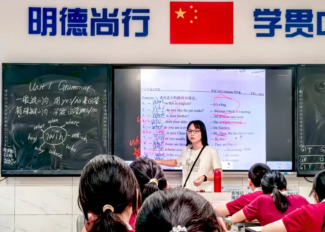 林妙琼老师的亮相课选的是7AU1的语法课,本节课的学习内容是特殊疑问句。为了让学生对枯燥的语法课堂更感兴趣,林老师采用情境教学法,结合本单元的主题“Friendship(友谊)”,以哪吒来到学校遭遇交友困境设置情境,哪吒在师傅太乙真人的帮助下,一步步学会用英语的特殊疑问词、词组和特殊疑问句型来结交朋友,引导学生发现语法现象、总结语法规律,最后以哪吒和敖丙的角色扮演对话作为输出,达到本课语言、思维和情感的目标。本节课重难点突出,板书细致,并且能够结合AI技术和希沃互动游戏来进行教学设计,是一节实用、有效的公开课。