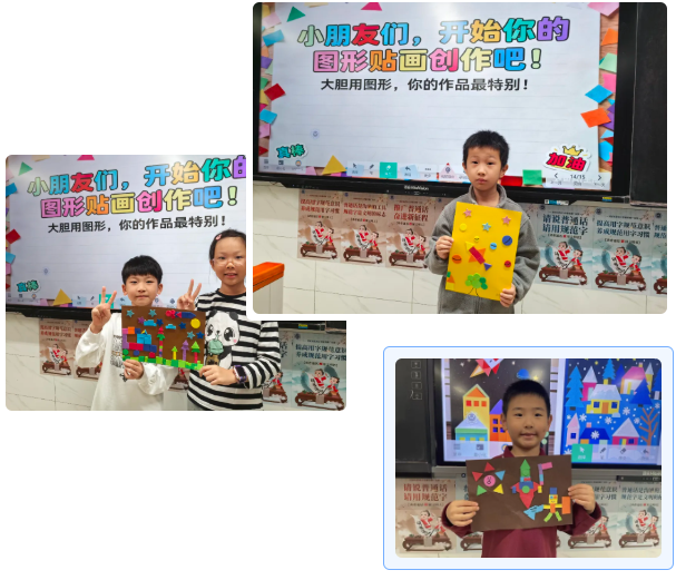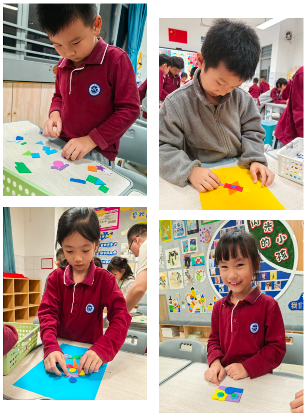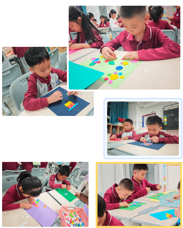 你负责挑选,我负责摆放,他负责参谋——团队协作的温暖在教室里静静流淌。当一个图案渐渐成型,总会引来一阵惊喜的低呼。待作品完美呈现,孩子们小心翼翼地撕下不干胶,将那些承载着梦想的图形,轻轻地、牢牢地贴在卡纸上。每一个动作都那么专注,仿佛在完成一件传世的艺术品。