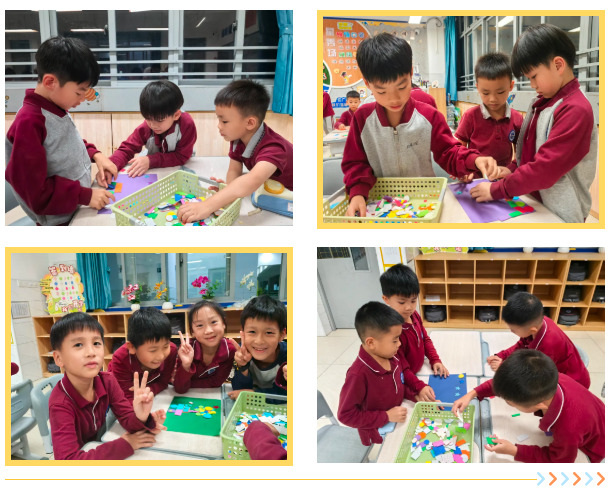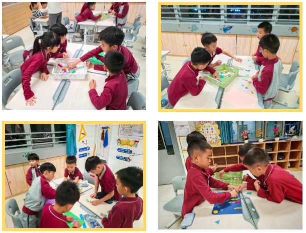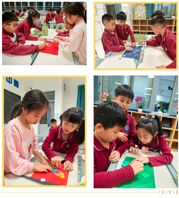 最让人期待的时刻终于到来。小组合作的创意工坊开始了!同学们围坐在一起,小脑袋凑得很近,叽叽喳喳地讨论着心中的图案。有的说要拼一只在翩翩起舞的蝴蝶,有的想造一座会发光的城堡......商量既定,小手便开始在五彩的卡纸上忙碌起来。圆形、三角形、正方形......这些最普通的形状,在孩子们指尖跳舞,排列、组合、调整,像一场无声的交响乐。