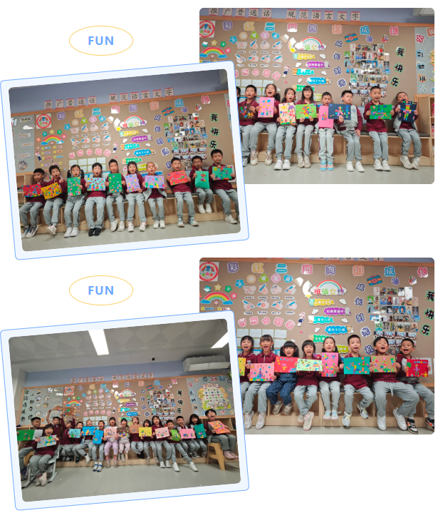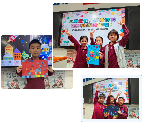 时钟滴答,活动渐近尾声。举起作品合影时,每张小脸上都洋溢着创造的喜悦与自豪。那些由简单图形变幻出的奇妙世界——星空下的城堡、太空里的火箭、开往童年的火车......不仅是数学与艺术的相遇,更是想象力最动人的绽放。