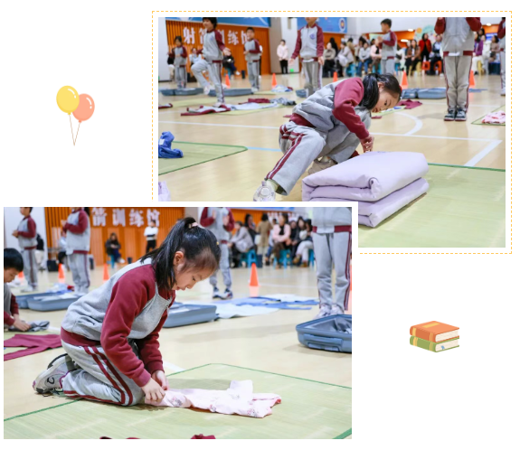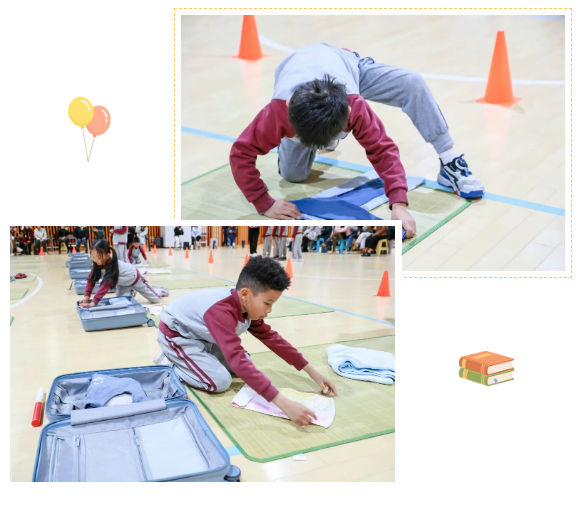 二年级生活技能比赛现场,孩子们熟练地叠衣服、叠被子、套枕套、整理行李箱,动作迅速又整齐,生活自理能力令人惊喜。