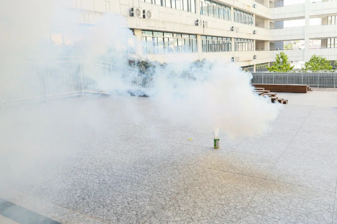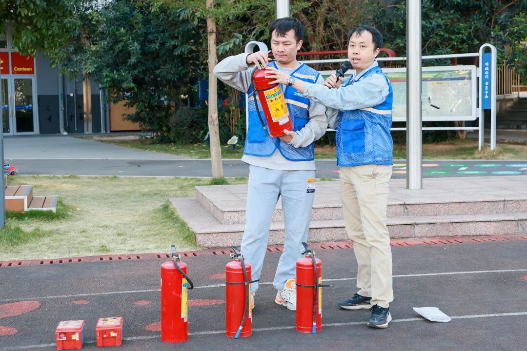 全员集结后,消防工作人员为师生带来了干货满满的灭火器实操和消毒面罩佩戴培训。他们现场讲解了干粉灭火器的使用方法和注意事项,并亲自示范了“提、拔、握、压”四个标准步骤。