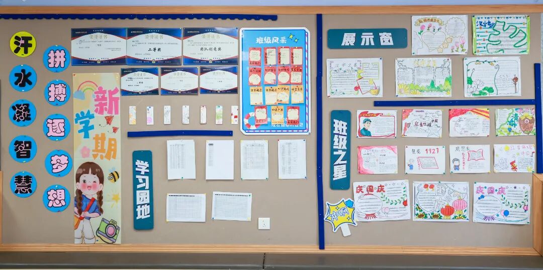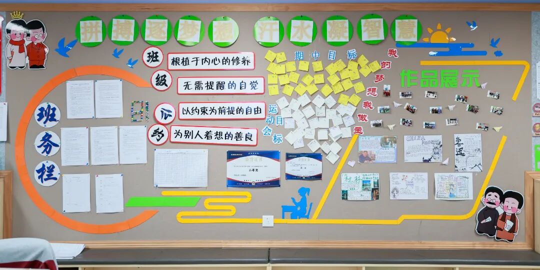 汗水浇灌理想,拼搏铸就成长。八年级的黑板报以“汗水凝智慧,拼搏逐梦想”为主题,版面设计充满力量感与感染力。鲜艳的色彩、昂扬的标语、生动的插画,将少年们在课堂上专注钻研、在运动场上奋力奔跑、在自习室里默默坚守的场景一一呈现。每一幅画面都诉说着“一分耕耘,一分收获”的信念,每一段文字都传递着为梦想全力以赴的决心,展现了八年级学子脚踏实地、奋勇争先的青春姿态。