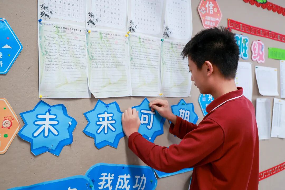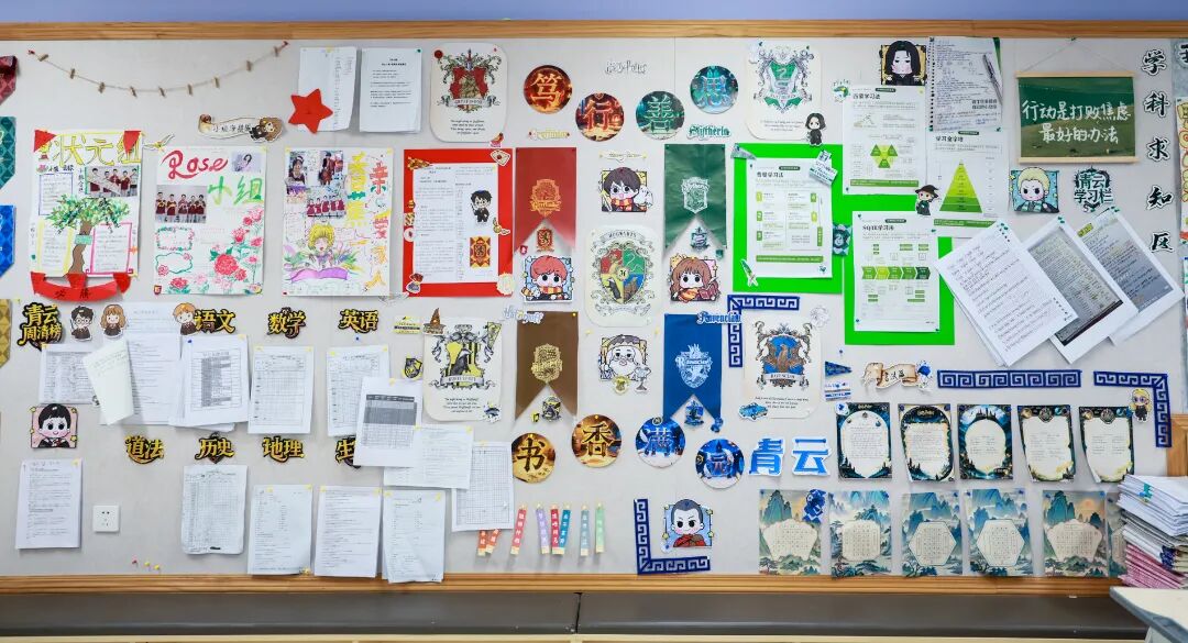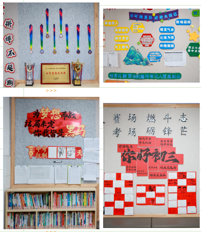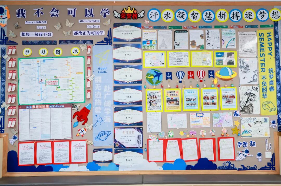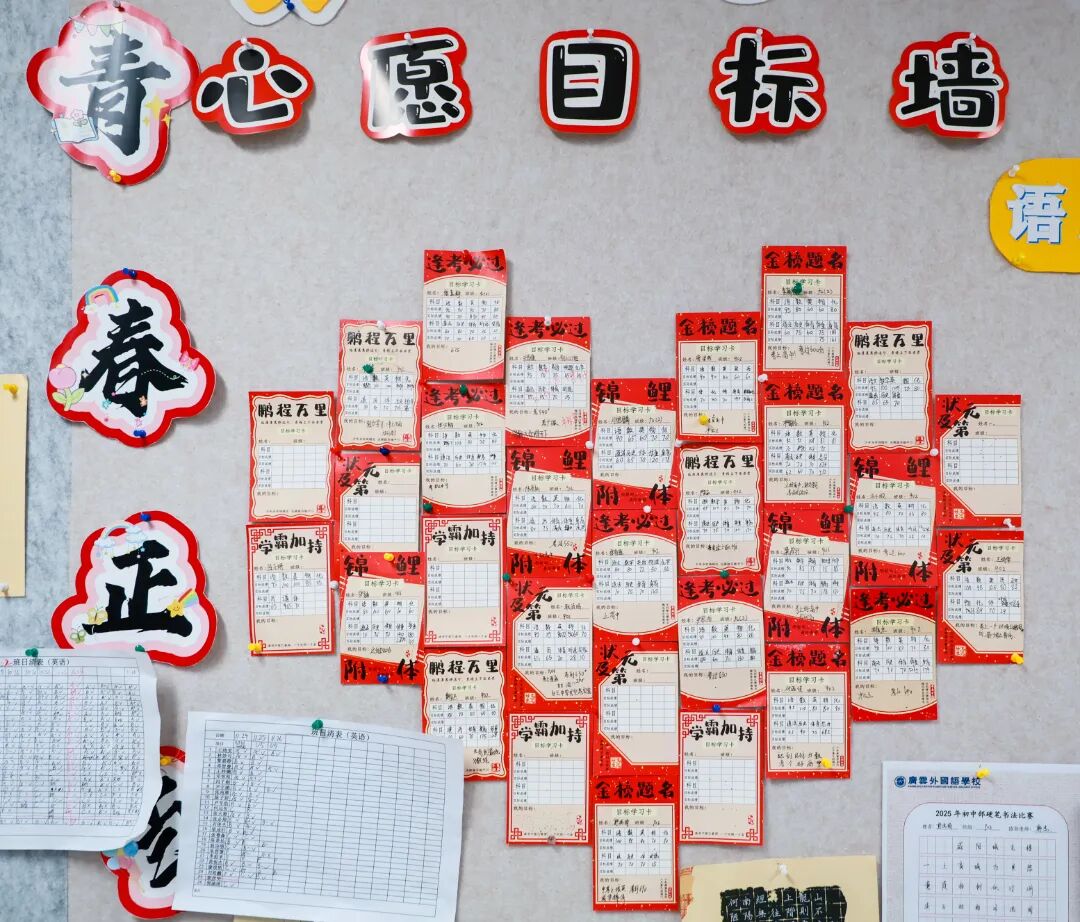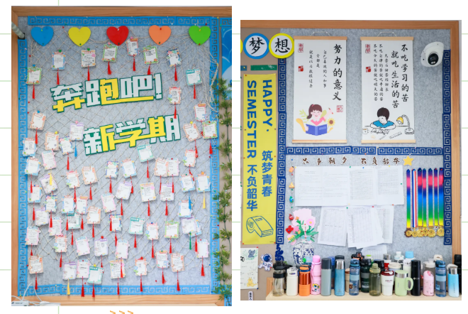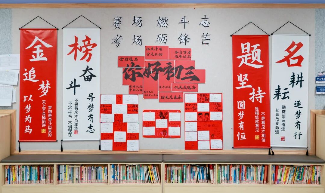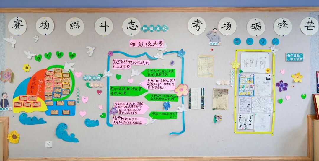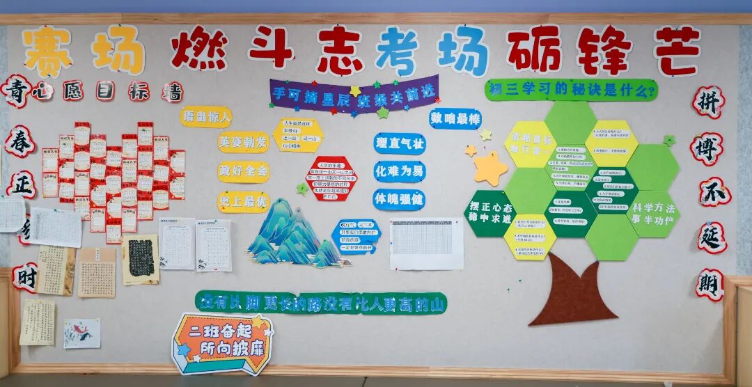 少年当有凌云志,不负韶华逐梦行。九年级学子以“赛场燃斗志,考场砺锋芒”为主题,用激昂的笔墨勾勒出冲刺的姿态。醒目的标语、坚定的誓言、拼搏的剪影,将体育赛场的热血与升学考场的坚毅融为一体。黑板上的每一个字符都充满力量,每一处设计都饱含期许,既展现了九年级学子直面挑战、无畏前行的斗志,也传递着“乘风破浪,未来可期”的信念,为即将到来的考验注入了满满的正能量。