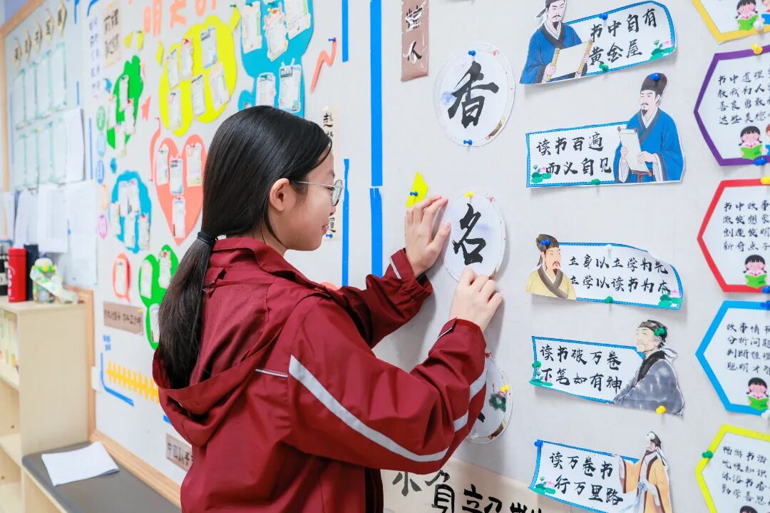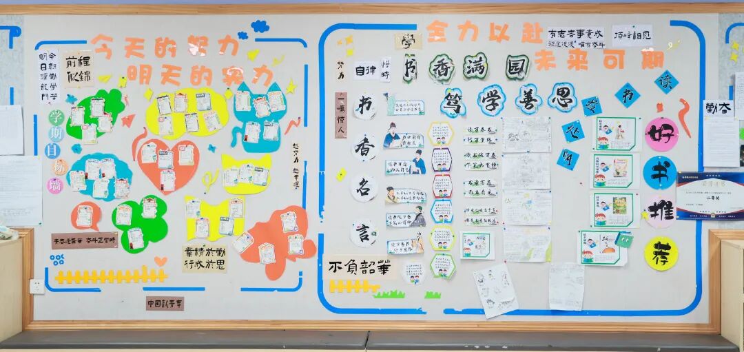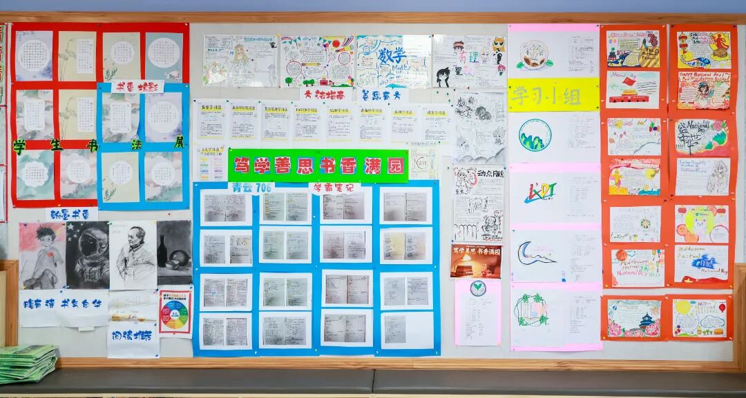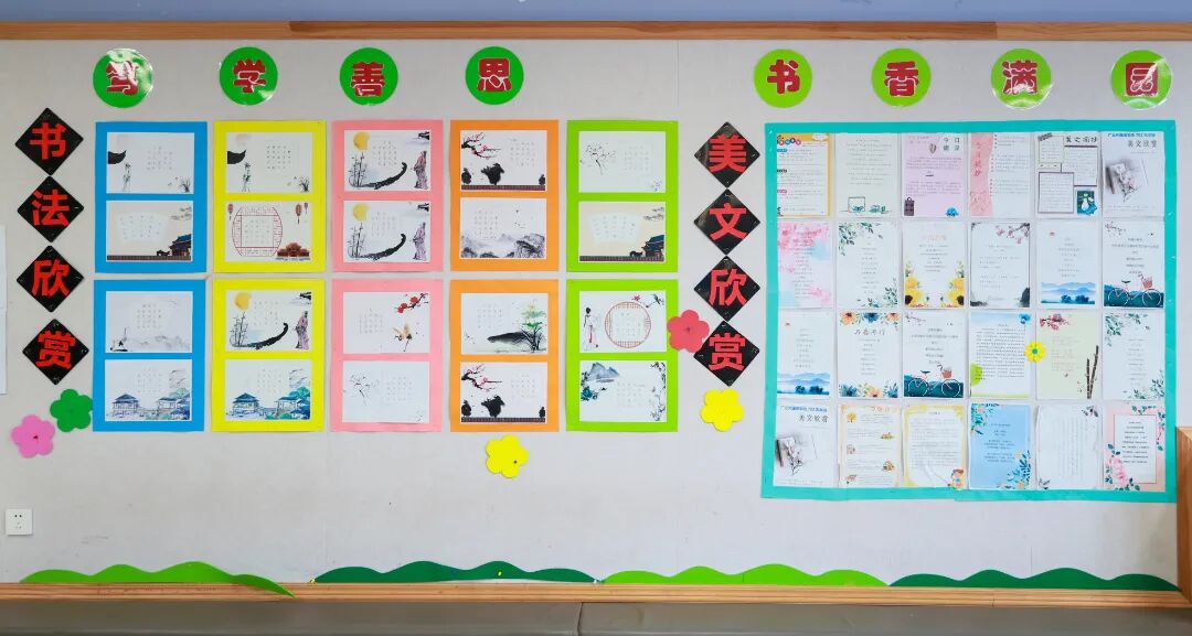 墨香浸润心灵,文脉传承不息。七年级学子以“笃学善思,书香满园”为核心,将经典诗句、读书感悟、学习妙招融入版面设计。淡雅的色彩搭配、工整的字迹排版,或是勾勒出伏案苦读的身影,或是摘录下启迪智慧的名言,每一处细节都彰显着少年们对知识的渴望与对书香的追求。黑板上的一笔一划,不仅是艺术的呈现,更是七年级学子笃学不倦、善思勤问的精神写照。
